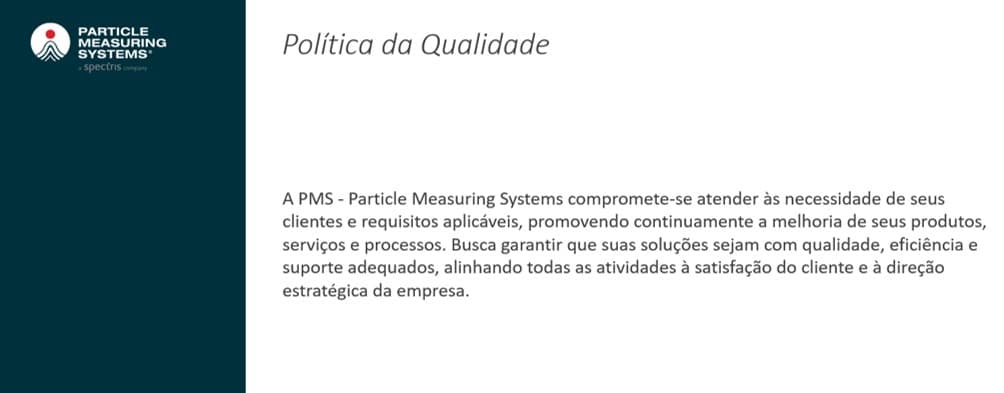 Nossa Política de Qualidade do Brasil está alinhada com os objetivos da nossa matriz e compromete-se atender às necessidade de seus clientes e requisitos aplicáveis, promovendo continuamente a melhoria de seus produtos, serviços e processos. Busca garantir que suas soluções sejam com qualidade, eficiência e suporte adequados, alinhando todas as atividades à satisfação do cliente e à direção estratégica da empresa.